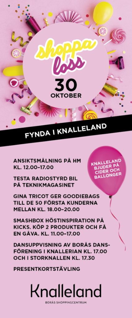 Publicerad: 2019-10-14 Shoppa loss 30 oktober Fynda i Knalleland ANSIKTSMÅLNING PÅ HM KL. 12.00–17.00 TESTA RADIOSTYRD BIL PÅ TEKNIKMAGASINET GINA TRICOT GER GOODIEBAGS TILL DE 50...