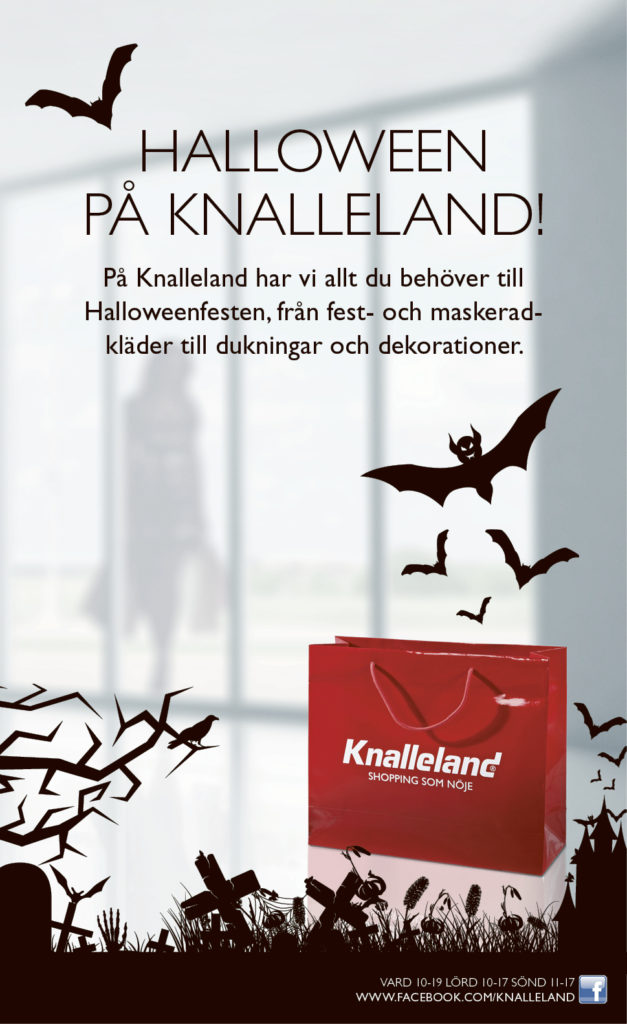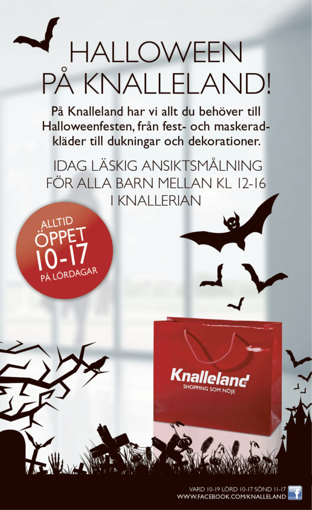Publicerad: 2013-10-26 HALLOWEEN PÅ KNALLELAND På Knalleland har vi allt du behöver till Halloweenfesten, från fest- och maskeradkläder till dukningar och dekorationer. Välkomna!